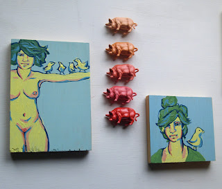 I've been painting on regular flat surfaces again, something I got away from in 2012. I've been drawn to the small, and the simple. I'm into portraits of no-one, and I've often tried to dress that up as being about something much more philosophical that it is, but this time around I'm letting it be what it is. Funky, small, colourful paintings of girls. Here's one you saw last post.